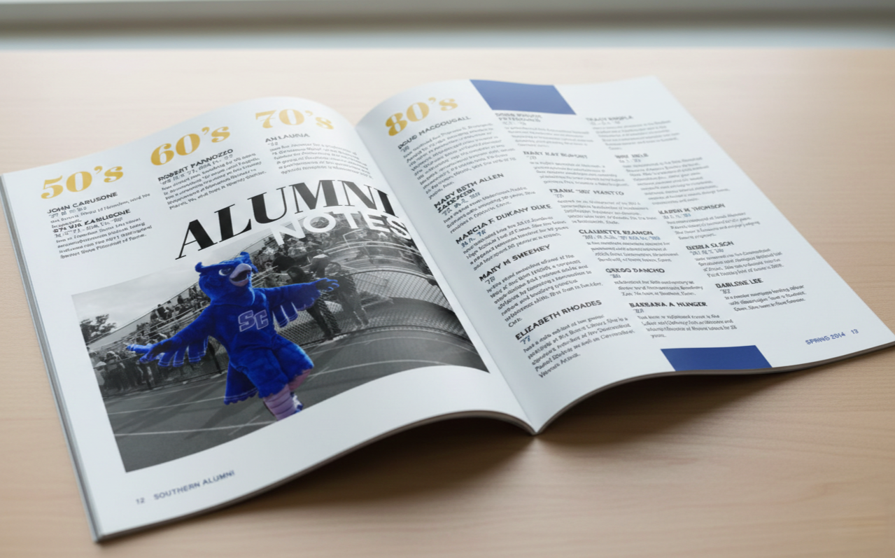 I redesigned a 2014 alumni magazine from Southern Connecticut State University with a more modern and cohesive editorial approach.